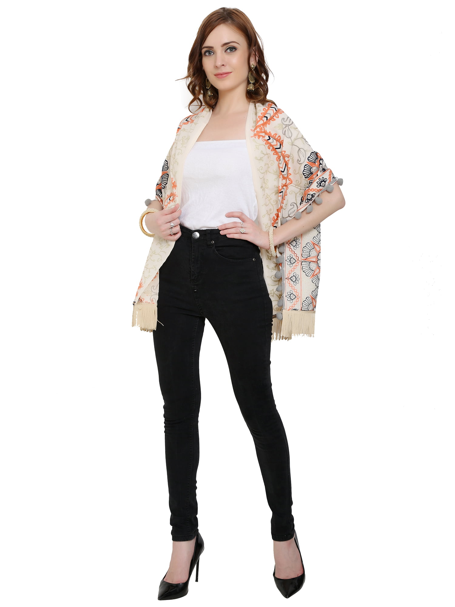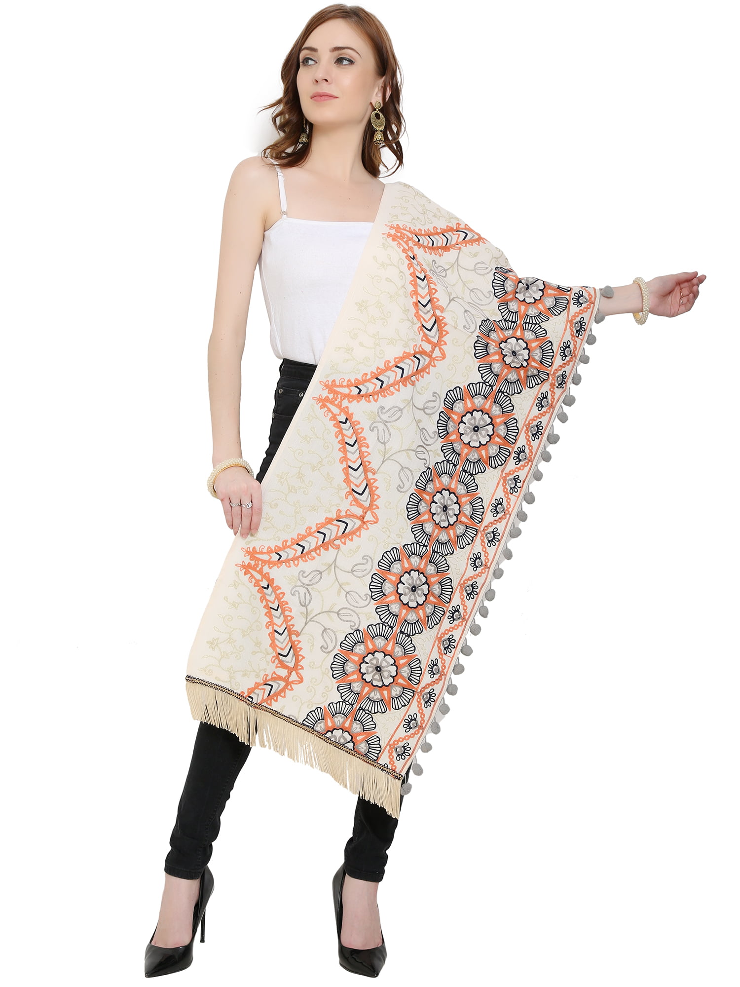 Cream / Off White Color Khadi Stole with Woolen Embroidery & Tassels